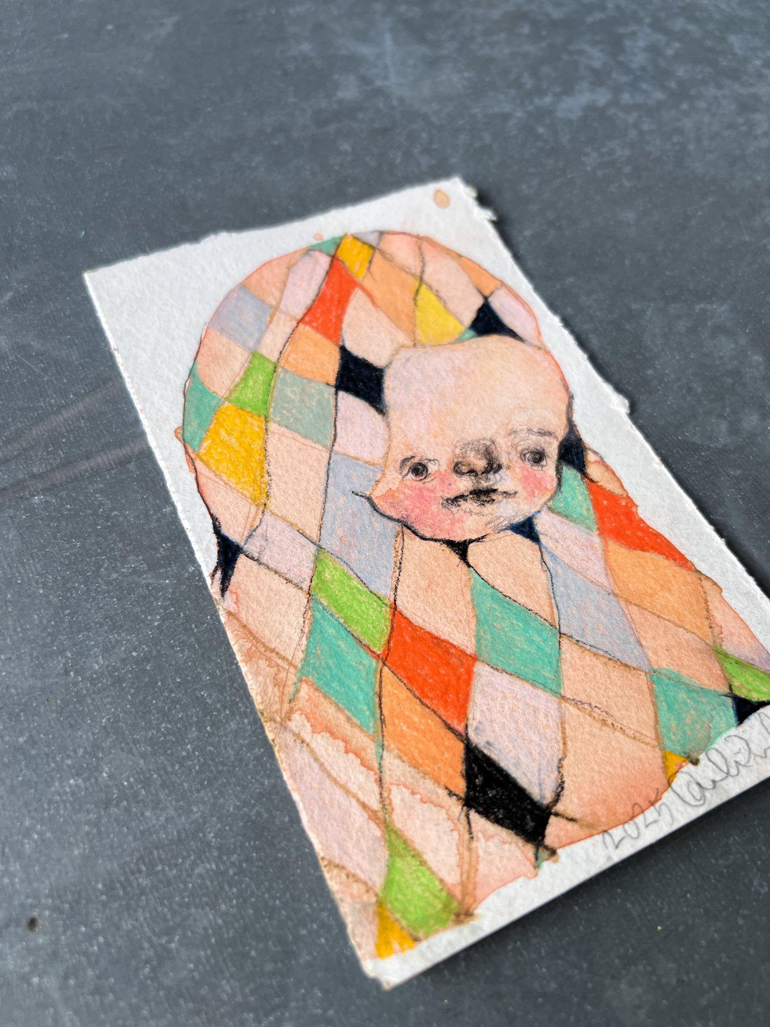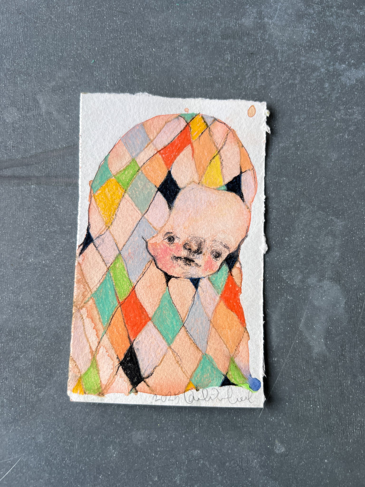 Dette er et originalt værk med titlen ‘lille sarte særling (3)’ og der findes kun denne ene. One of a kind. Lavet på tykt akvarelpapir. Mixed media (akvarel, farveblyant, blyant)